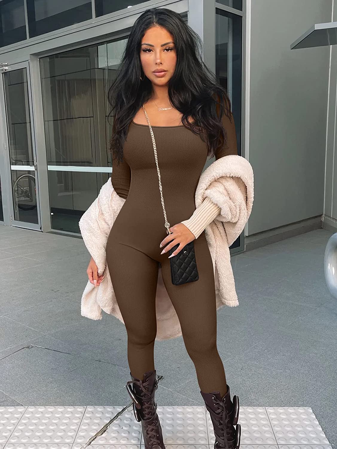 - 90%Nylon+10% Spandex.Ribbed square neck long sleeve jumpsuits