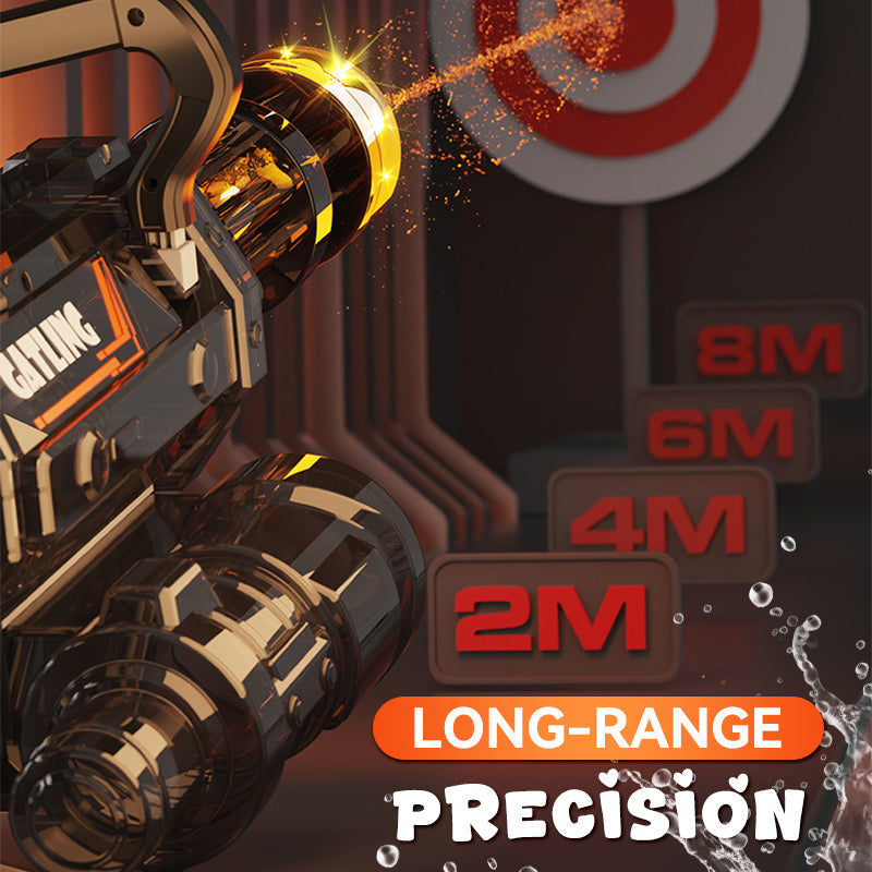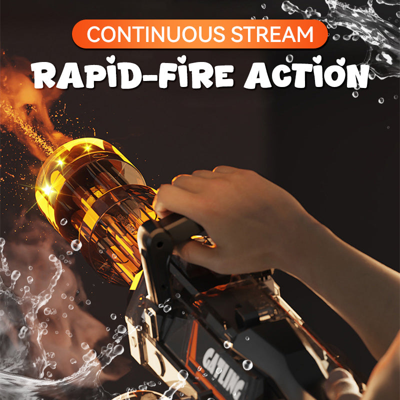 HIGH-SPEED GATLING WATER ACTION – Unleash rapid-fire action with a rotating barrel for continuous water streams, making it perfect for intense backyard battles or competitive team games. Stay ahead in the fun!
