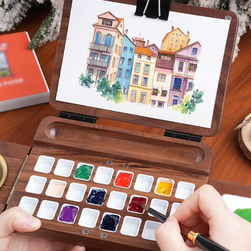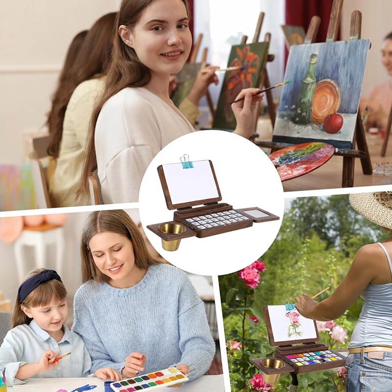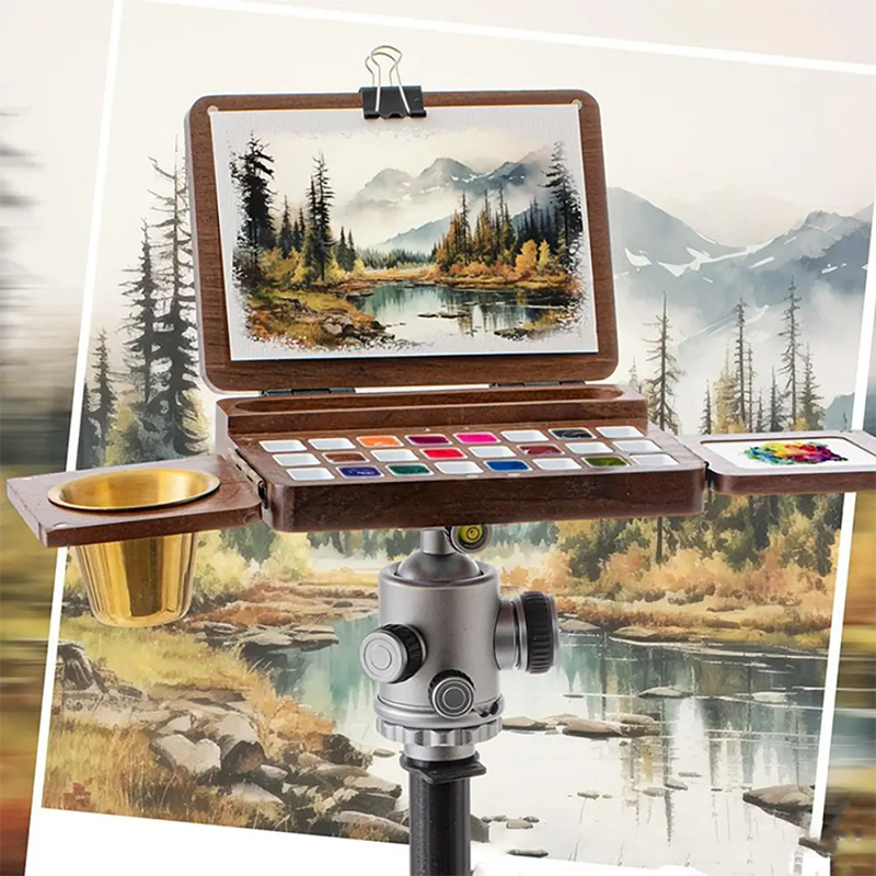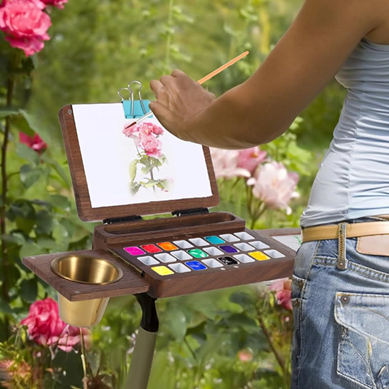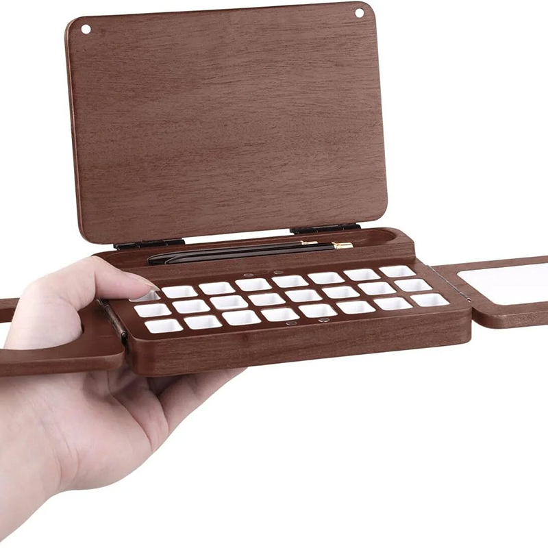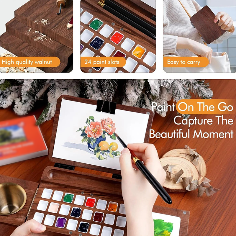 ALL-IN-ONE DESIGN: Holds 24 colors with dedicated brush slots and a mixing area. The left side doubles as a water cup, and the lid securely holds paper as an easel—perfect for artists who demand versatility without compromise.