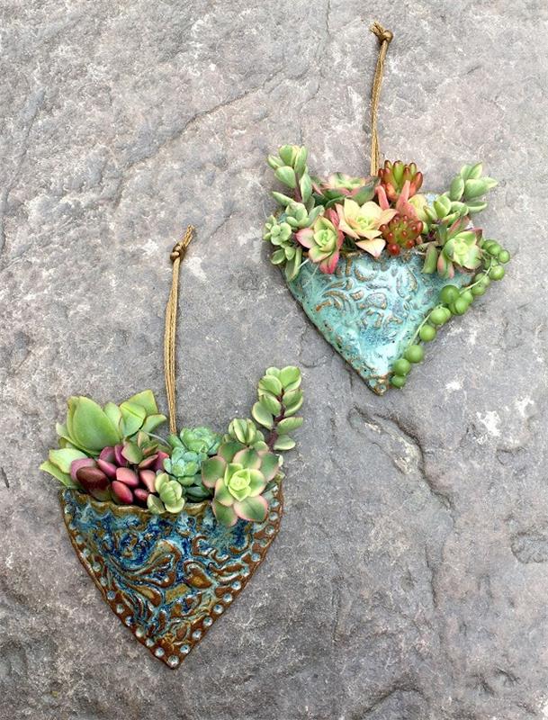 Can’t you imagine a tree filled with these succulent hearts in all different colors? Cool, denim blue and teal glaze, and semi-rusty colored tracings. The other is a lighter version of the same colors for a pretty pairing.